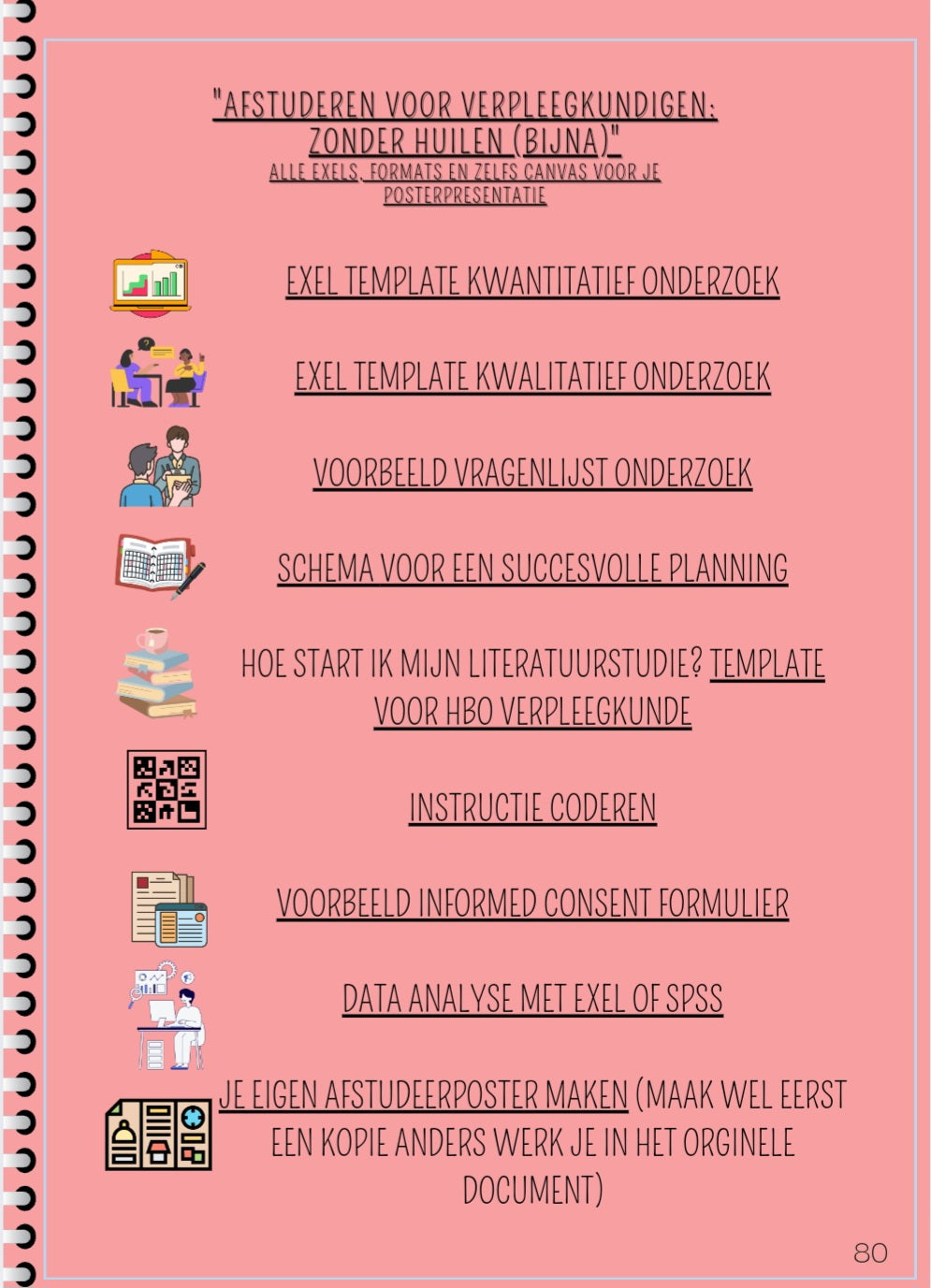 Voor de studenten die afstuderen heb ik verschillende hulpmiddelen gemaakt. Er is een exel voor kwalitatief en kwantitatief onderzoek, in begrijpbare taal geef ik je uitleg en voorbeeld over het proces van coderen. Ook geef ik je voorbeelden van hoe je een literatuur studie uitvoert en je krijgt een planning die je zelf kan aanpassen voor je afstuderen.